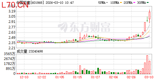 中国能建股价创出历史新高,截至10:08,该股上涨9.86%,股价报3.23元,成交量15.48亿股,成交金额46.66亿元,换手率4.77%,该股最新A股总市值达1047.45亿元,该股A股流通市值1047.45亿元。