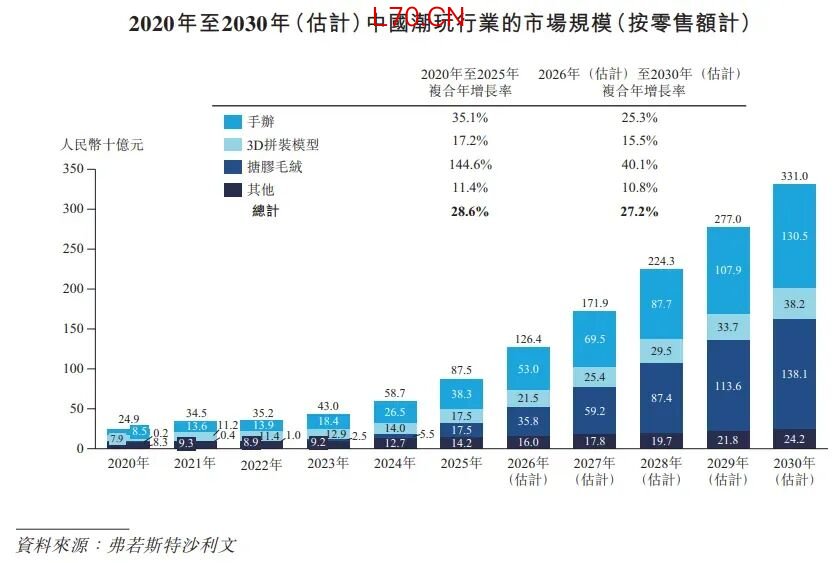 根据弗若斯特沙利文(Frost & Sullivan)的报告,中国潮玩行业呈现快速增长态势,零售额由2020年的人民币249亿元跃升至2025年的人民币875亿元,实现28.6%的强劲复合年增长率。该行业预计将由2026年的人民币1,264亿元增长至2030年的人民币3,310亿元,实现27.2%的复合年增长率。