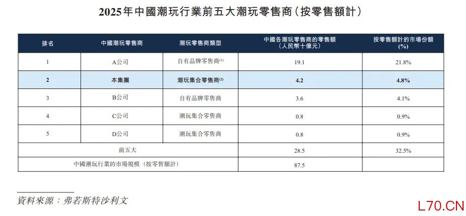 本公司2025年在中国的GMV达人民币42亿元,在中国潮玩行业排名第二,市场份额为4.8%。在中国潮玩行业按GMV计的前五大潮玩零售商中,按2020年至2025年复合年增长率计,本集团在GMV增幅及门店数量增幅方面均位居中国首位。