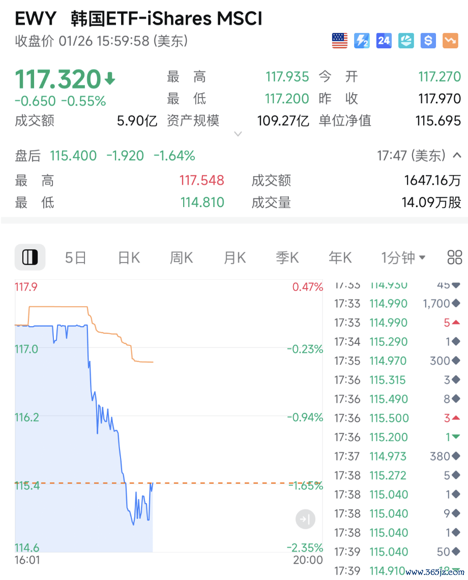美东时间1月26日,美国总统特朗普宣布,因韩国国会迟迟未批准美韩贸易协议,他已决定将对韩国汽车、木材、制药产品以及其他“对等关税”项目的税率从15%上调至25%。受此影响,在美上市的韩国ETF(韩国ETF-iShares MSCI)在美股盘后直线跳水,一度大跌超2%。