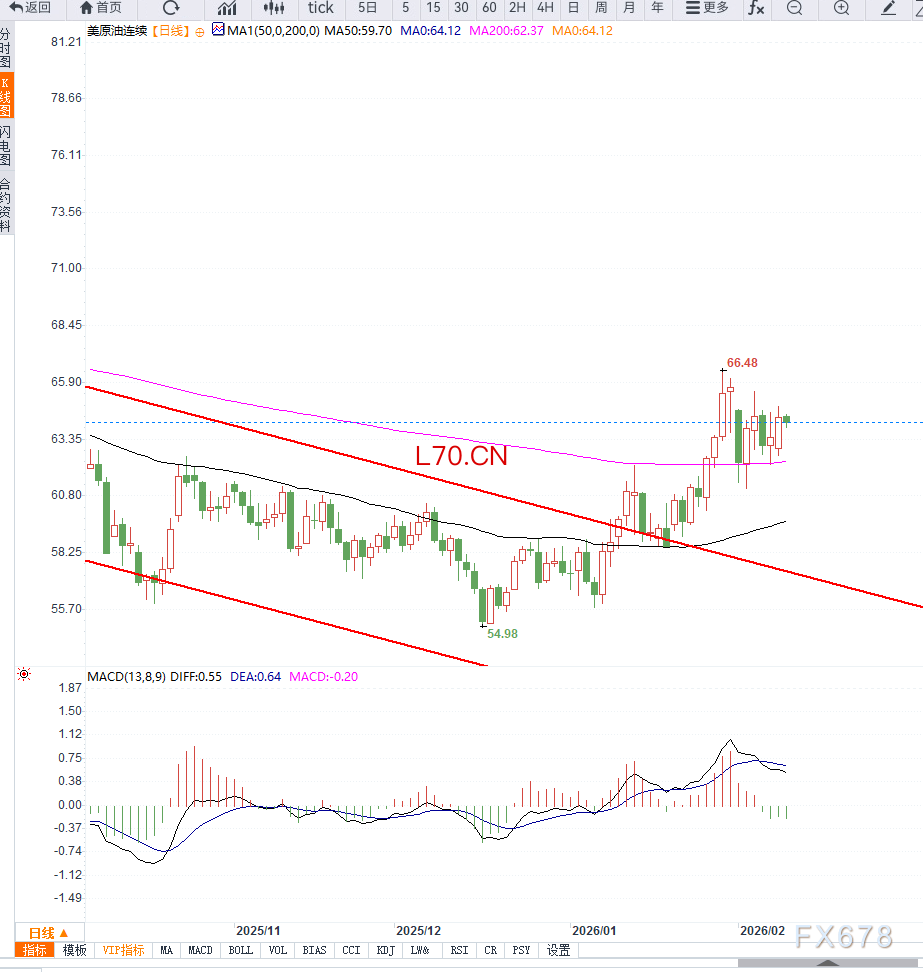 上行方面,65.00美元为首个关键阻力区域,若有效突破,油价有望进一步向66.80—67.50美元区间推进。但在供应过剩预期未明显改善之前,油价上行空间仍可能受到限制。整体来看,WTI原油当前仍处于区间震荡格局,短线反弹更多依赖情绪与事件驱动。