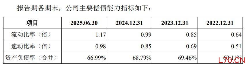 2022年末、2023年末、2024年末、2025年6月末,公司资产负债率分别为69.11%、69.46%、68.79%、66.99%,流动比率分别为0.64倍、0.85倍、0.99倍、1.17倍,速动比率分别为0.51倍、0.69倍、0.85倍、0.98倍。