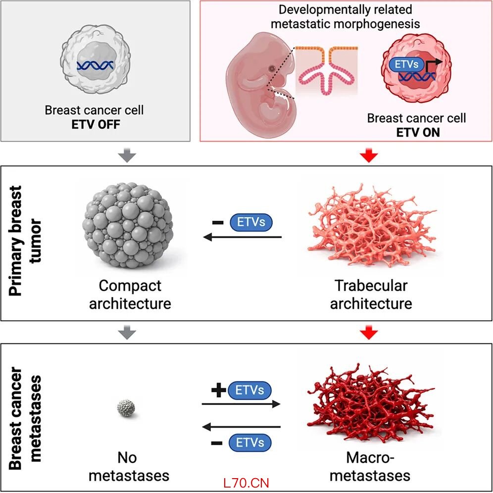 总的来说,帕多瓦大学和米兰大学团队的这项研究揭示了乳腺癌转移灶三维结构形成的因果链:ETV1/4/5活性→MTM状态→小梁形态发生→大规模转移扩张。这一发现将癌症转移与三维发育形态发生学紧密关联,改变了我们对乳腺癌转移灶的认知——乳腺癌转移不是无组织的细胞增殖,而是对胚胎发育程序的有序重新部署。