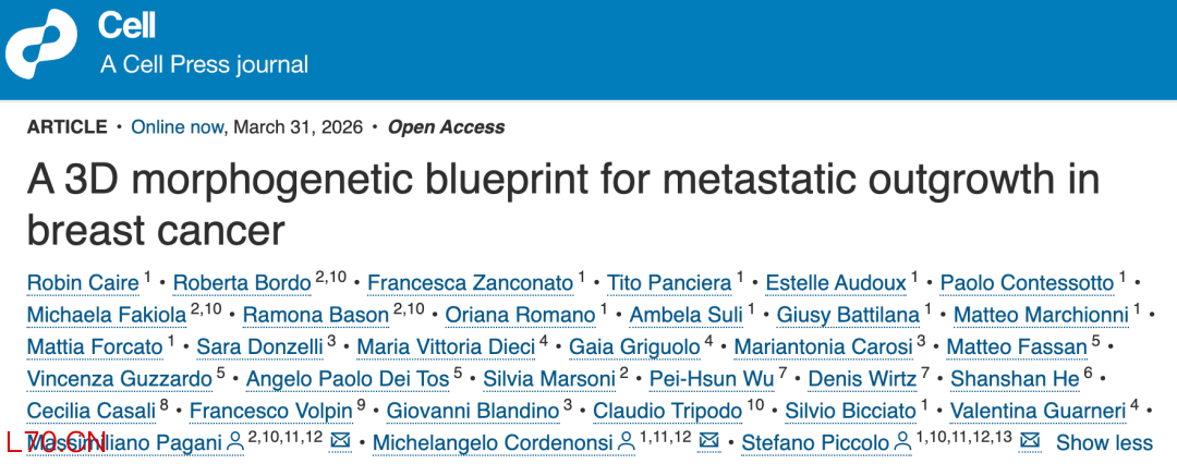 今天,由意大利帕多瓦大学Stefano Piccolo和Michelangelo Cordenonsi,以及米兰大学Massimiliano Pagani,联合领衔的研究团队,在Cell上发表一篇重磅研究论文[1],让我们对乳腺癌的转移灶有了全新的认知,并为预防乳腺癌转移带来新靶点。