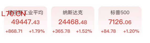 截至收盘,道琼斯工业平均指数飙升868.71 点,涨幅1.79%,收于49447.43点,纳斯达克综合指数上涨1.52%,收于24468.48点,标普500指数大涨1.2%,收于7126.06点,首次突破7100点关口。本周道指累计涨3.2%,纳指涨 6.84%,标普500指数涨4.53%。