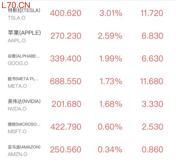 明星科技股普涨,特斯拉涨3.01%,苹果涨2.59%,英伟达、谷歌和Meta涨超1%。