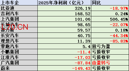 元股证券比亚迪、吉利汽车与上汽集团的净利润超100亿元,分别为326.19亿元、168.52亿元和101.06亿元,是2025年最赚钱的三家车企。