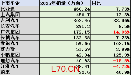 这12家乘用车上市公司中,有3家2025年的销量出现同比下滑,分别是广汽集团、江淮汽车和理想汽车。