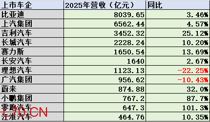 首先来看营收,2025年,这12家乘用车上市公司中,有10家的营收实现同比增长,广汽集团和理想汽车的营收分别同比下降10.43%和22.25%。