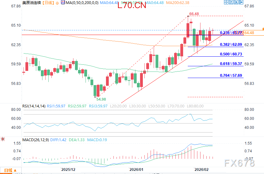 今日油价运行在63.96美元趋势线上方,且站稳63.80美元关键枢轴位。若失守趋势线,将是油价走弱的首个信号;若跌破62.20美元及61.12美元小幅摆动低点,油价动能将转为下行。但只要62.38美元的200日移动均线、59.70美元的50日移动均线支撑有效,长线走势仍获支撑。此外,60.73–59.37美元区间的回撤位同样构成支撑。
