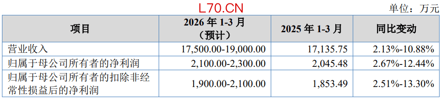 公司预计2026年1-3月的营业收入约为17,500.00万元至19,000.00万元,同比上升2.13%至10.88%;归属于母公司所有者的净利润约为2,100.00万元至2,300.00万元,同比上升2.67%至12.44%;归属于母公司所有者的扣除非经常性损益后的净利润约为1,900.00万元至2,100.00万元,同比上升2.51%至13.30%。